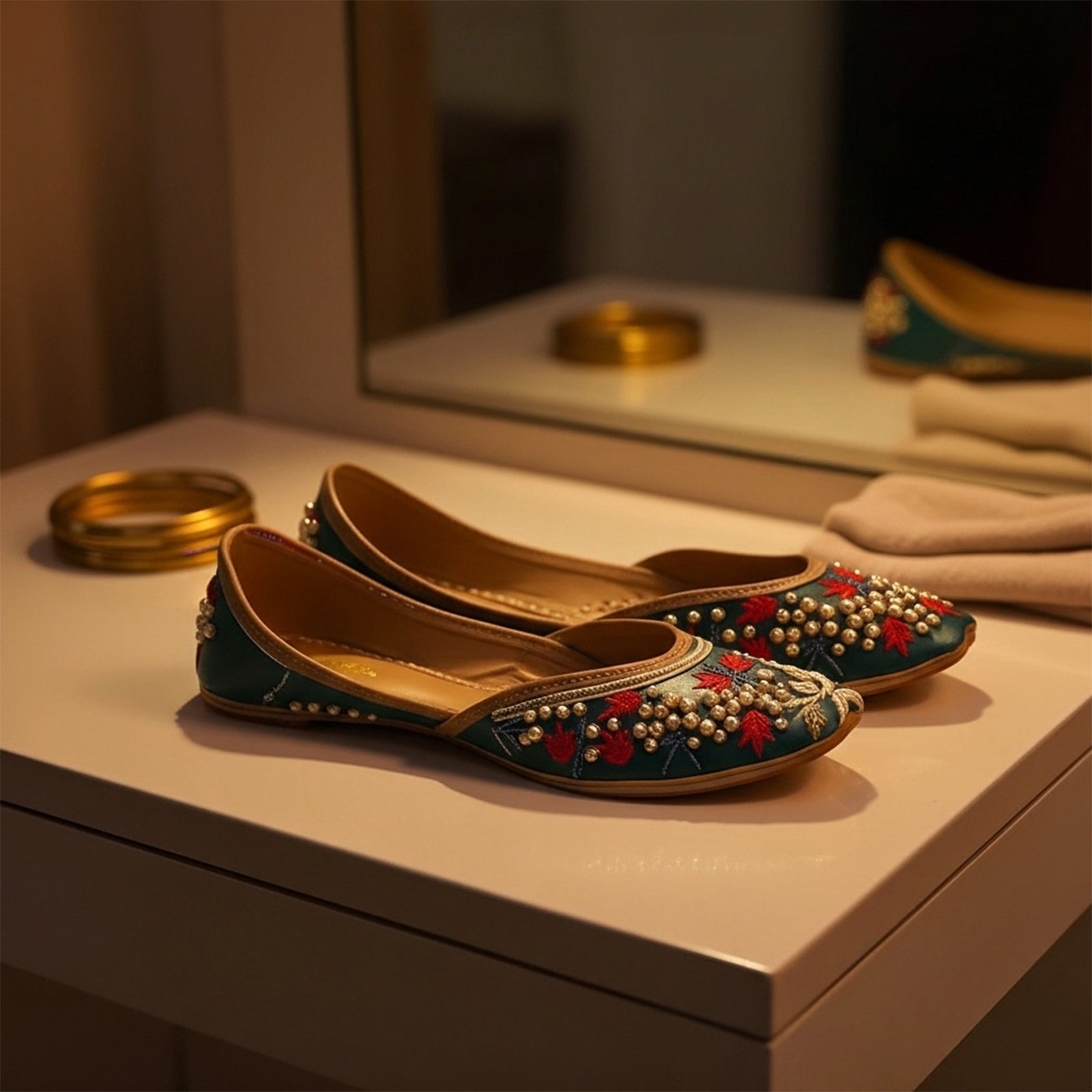 Step into striking elegance with Pearl Ember Garden, a jutti that blends rich festive colours with the sophistication of pearls. Crafted on a deep teal base, this design features vibrant ember-red and royal blue floral motifs, each meticulously hand-embroidered to create a bold, artistic bloom.