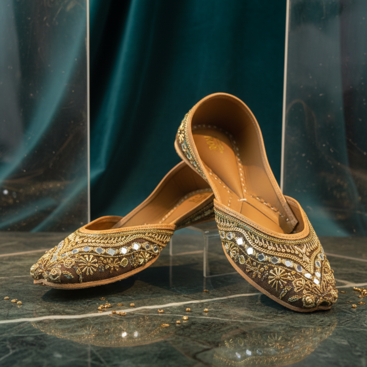 Elegant, neutral and effortlessly festive — Champagne Mirror Bloom is designed for those who love subtle luxury with a hint of sparkle. Crafted on a warm champagne-taupe base, this jutti features delicate gold zari florals, intricate beadwork, and hand-placed mirror accents that catch the light beautifully with every step.