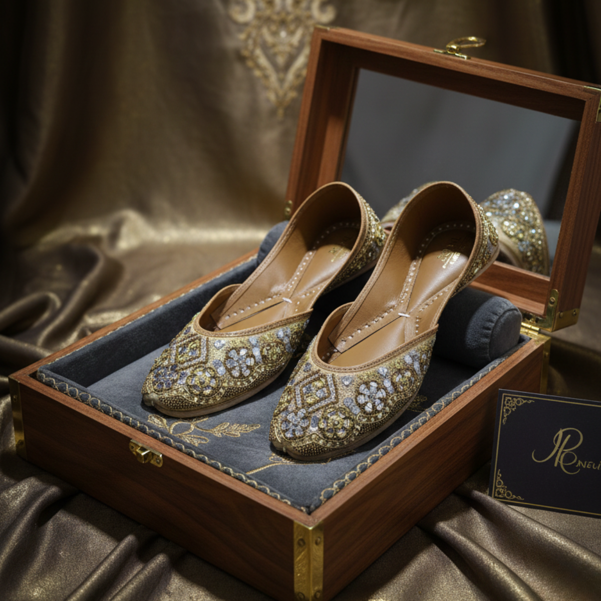 A stunning handcrafted gold jutti adorned with intricate mirror work, pearl accents, and fine bead embroidery. Designed to sparkle with every step, this pair brings the perfect blend of royal glamour and artisanal richness — ideal for weddings, receptions, and festive celebrations.