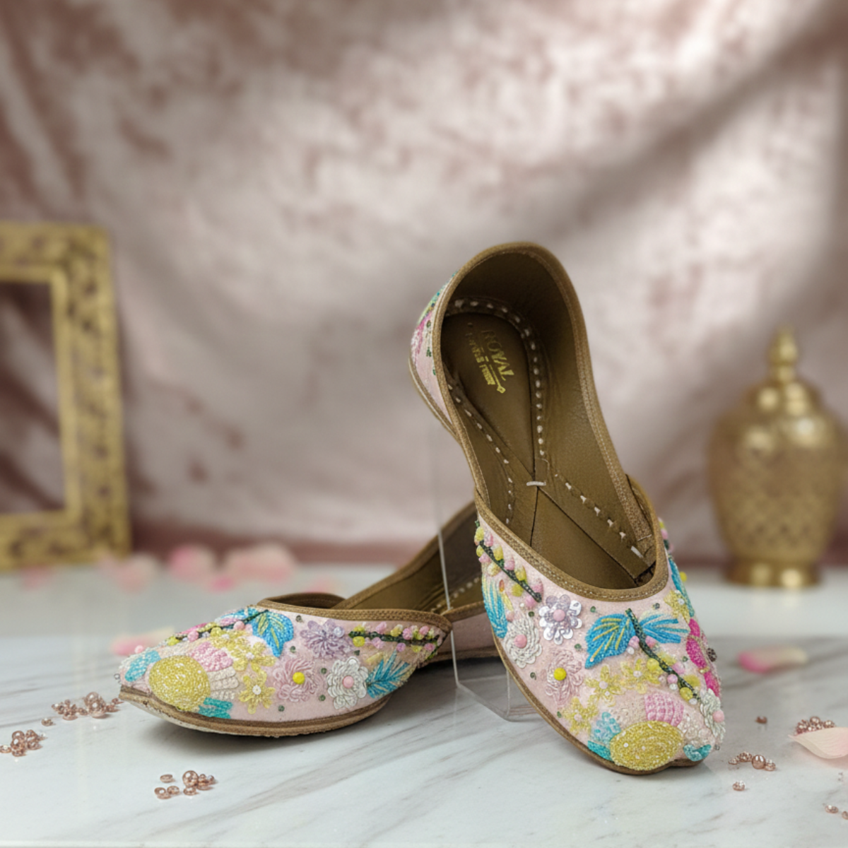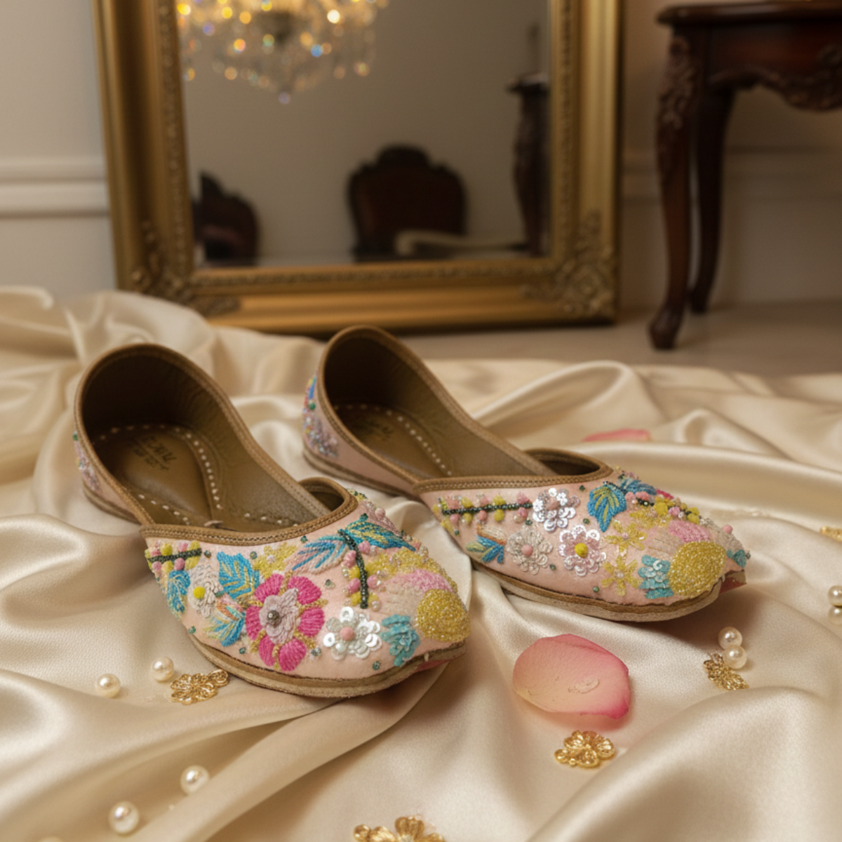 A cheerful, beautifully handcrafted jutti bursting with multicolour florals, beads, and delicate threadwork. Set on a soft neutral base, this pair adds instant charm and brightness to any outfit.