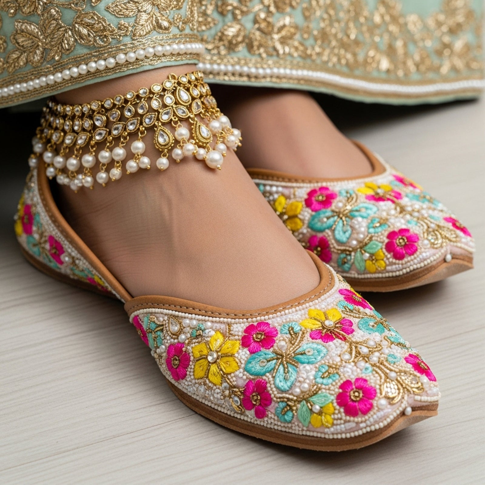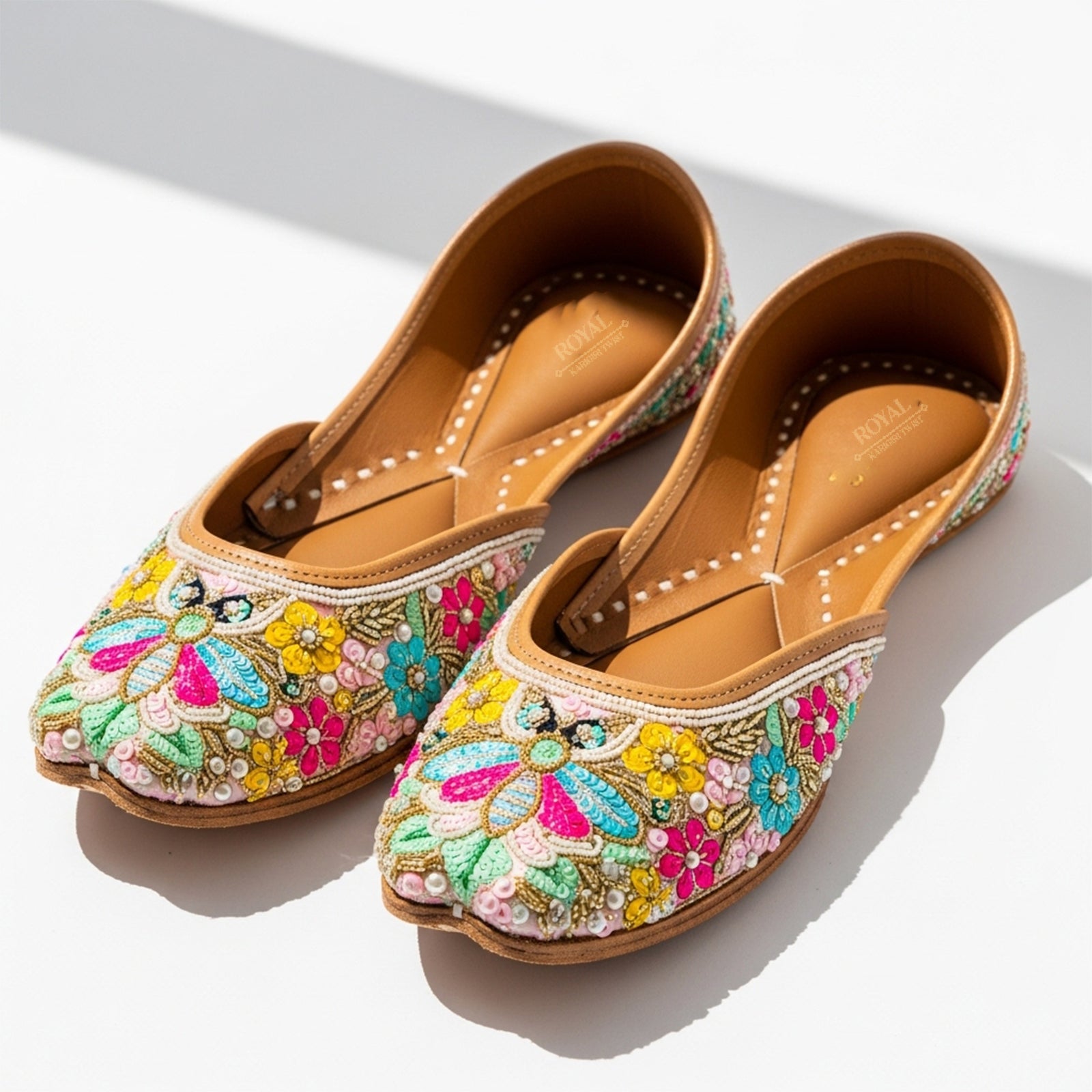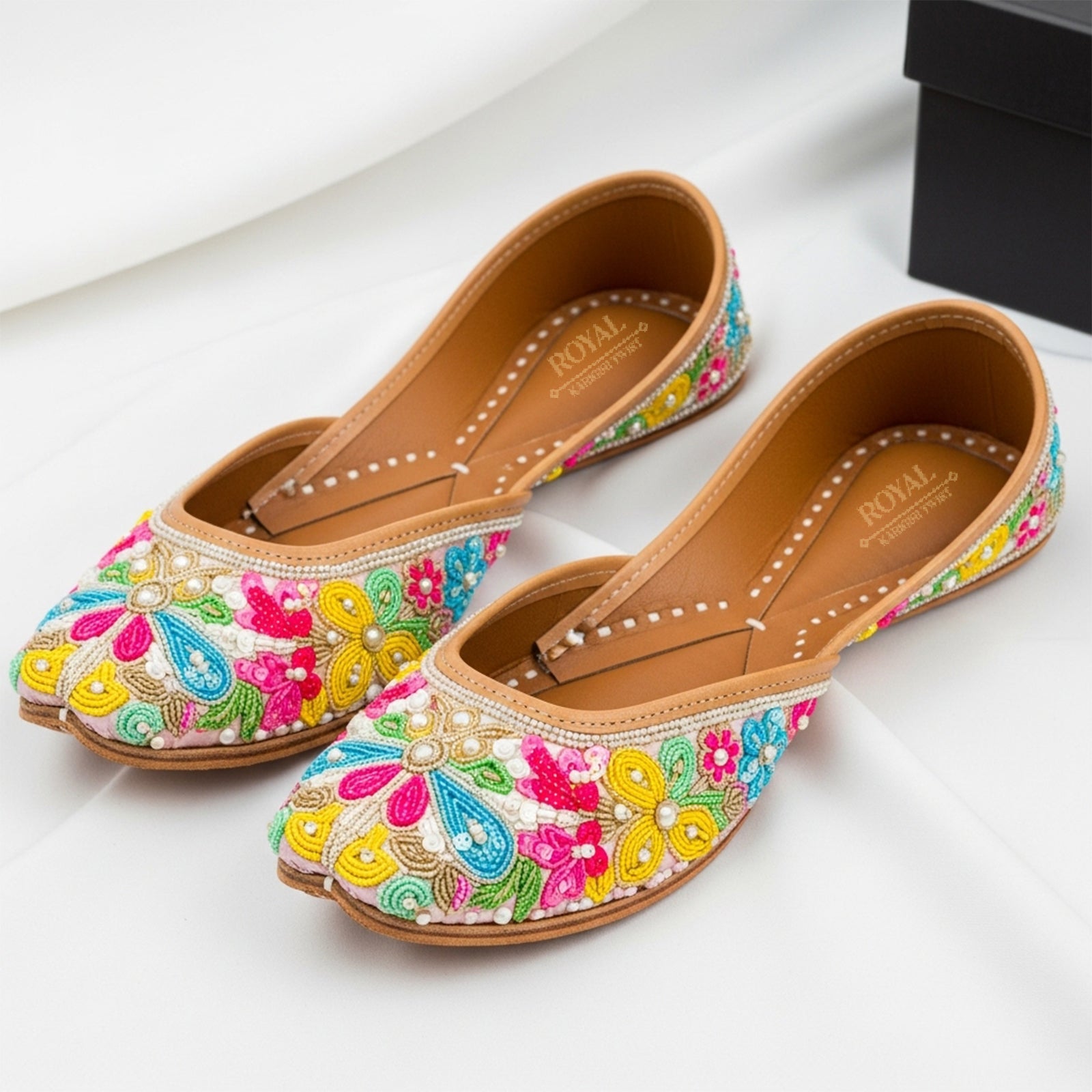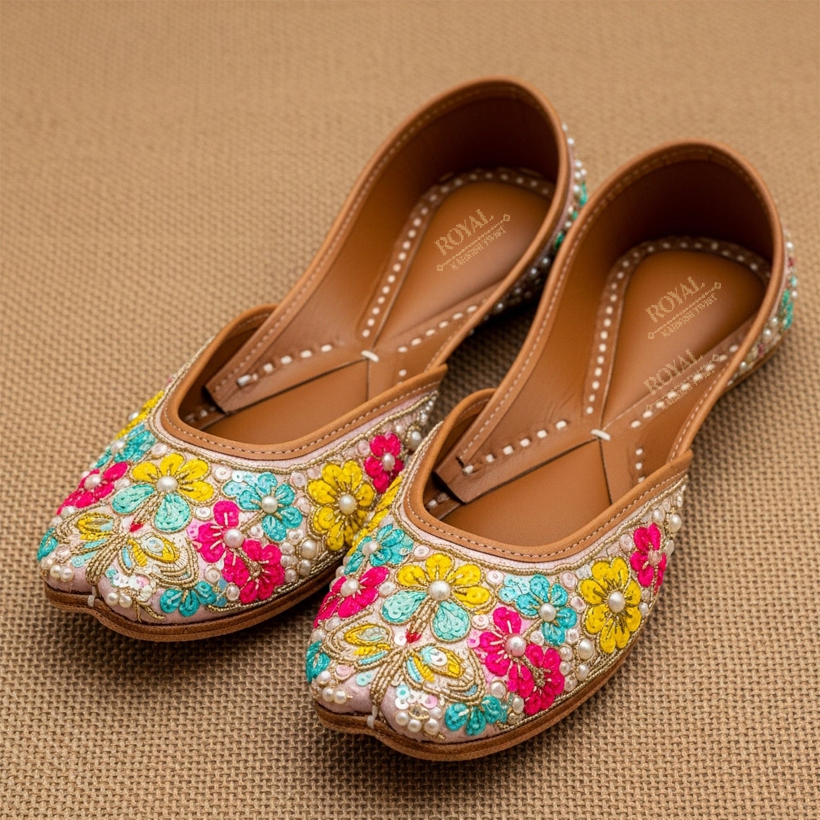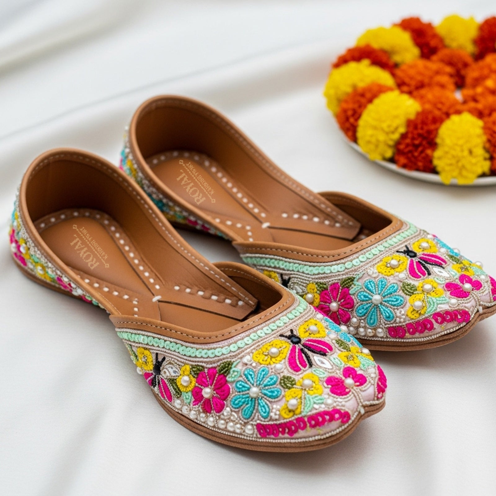 Each motif feels like a flower blossoming under the morning sun—playful, bright and full of life. With its double-cushioned sole and flexible construction, this jutti ensures cloud-like comfort while adding a dreamy, feminine charm to every outfit.