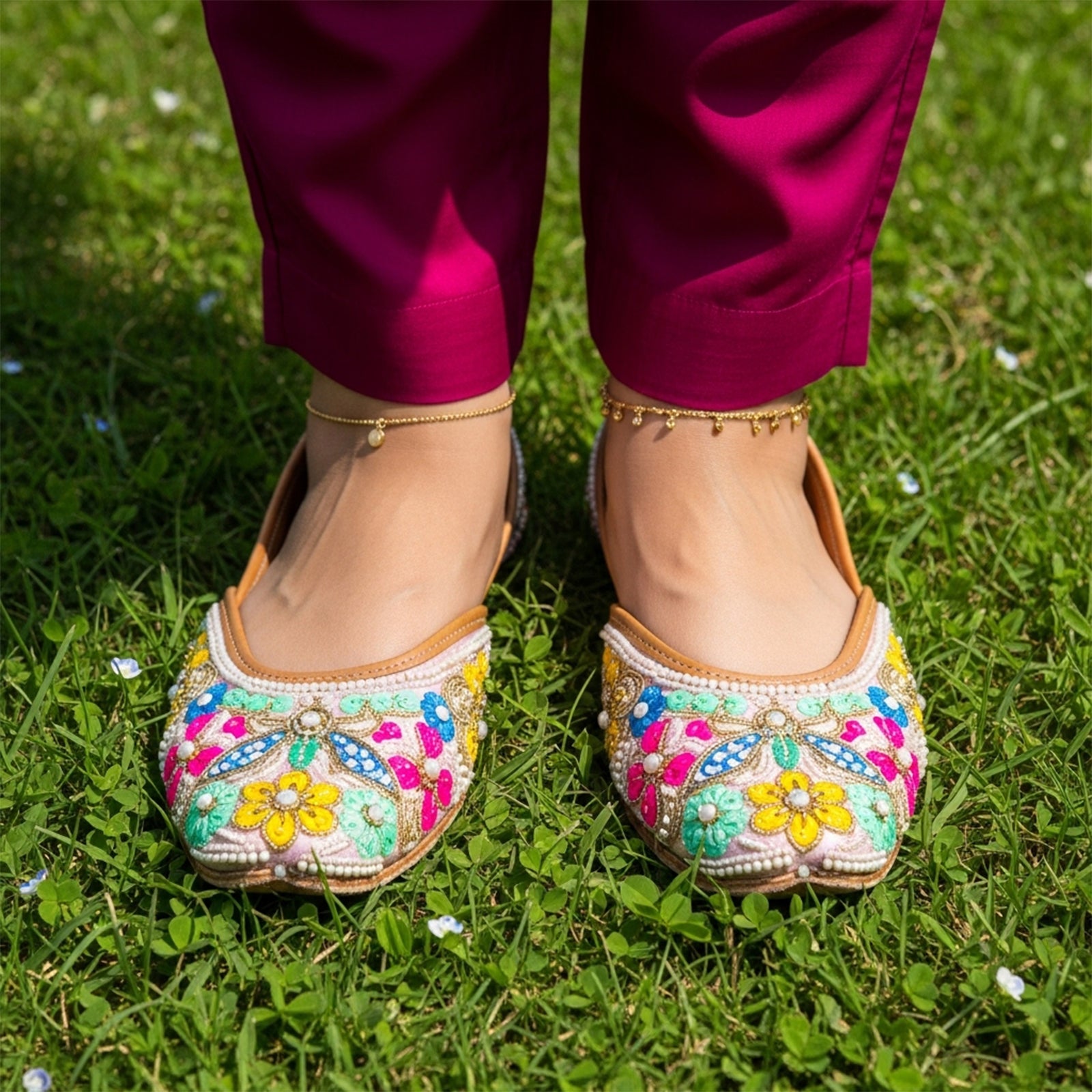 Step into the freshness of spring with Rosy Spring Garden, a jutti designed to celebrate colour, joy and delicate craftsmanship. Set on a blush-pink base, this pair comes alive with vibrant multicolour floral embroidery, hand-stitched beads, sequins and pearls that create a soft, enchanting shimmer.